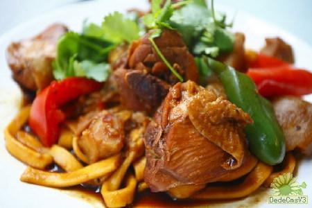 将鸡到入锅内翻大火炒片刻。 4、将生姜、干线椒(红)下锅与鸡一起翻炒,直到锅中没有水份,鸡块被油炸的金黄,很是好看