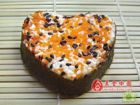 7、紫菜剪成与心饭团的高度同高,然后捆着边包围饭团,再在上面放些蟹籽、黑芝麻,压实,切段
