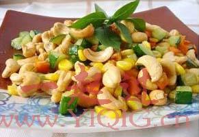 美食轻松做——腰果玉米丁,玉米具有排毒养颜、降血压、降胆固醇和预防便秘等作用;腰果含有丰富的不饱和脂肪酸和油脂,有保护心血管、润肠通便、强身健体和润肤抗衰老的功效。腰果玉米这道菜吃起来清甜酥脆,还有润肤美容的食疗效果。腰果玉米丁是一道营养丰富的素食小炒,吃起来清甜酥脆,容易消化,还有润肤美容的食疗作用,很适合想Keep Fit的MM经常食用。