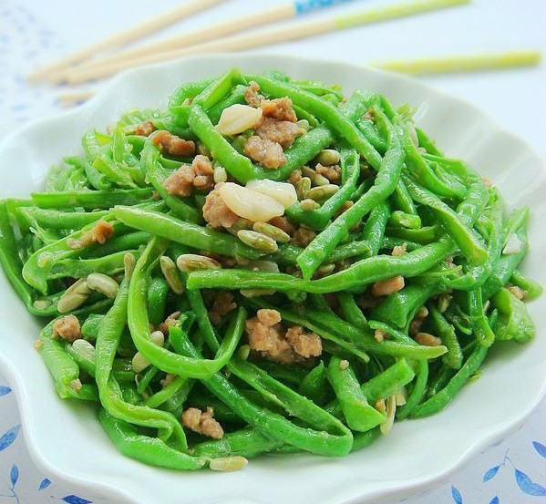 6、用锅内剩的底油,加蒜末爆香,放入豆角,翻炒2分钟。再放入炒好的肉馅,再调入盐,鸡精出锅即可。