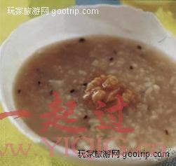 核桃芝麻粥。核桃是食疗佳品。无论是配药用,还是单独生吃、水煮、作糖蘸、烧菜,都有补血养气、补肾填精、止咳平喘、润燥通便等良好功效。核桃的食法很多,将核桃加适量盐水煮,喝水吃渣可治肾虚腰痛、遗精、萎、健忘、耳鸣、尿频等症。核桃与薏仁、栗子等同煮作粥吃,能治尿频、遗精、大便溏泻、五更泻等病症。核桃与芝麻、莲子同做糖蘸,能补心健脑,还能治盗汗。生吃核桃与桂圆肉、山楂,能改善心脏功能。核桃还广泛用于治疗神经衰弱、高血压、冠心病、肺气肿、胃痛等症。