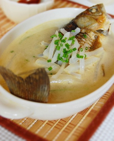 萝卜丝鲫鱼汤 鲫鱼和白萝卜一起烹调,可提供人体所需的蛋白质、脂肪、维生素及矿物质,是一道营养丰富的菜肴,可经常食用。