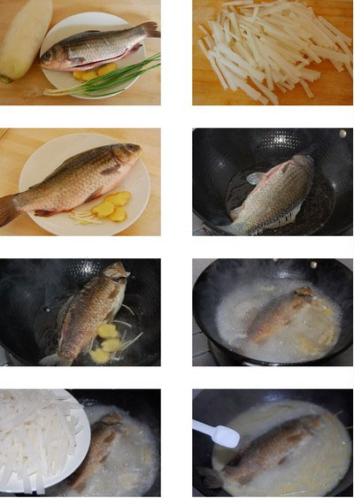 用料: 鲫鱼1条、白萝卜200克、葱姜适量、油、盐适量