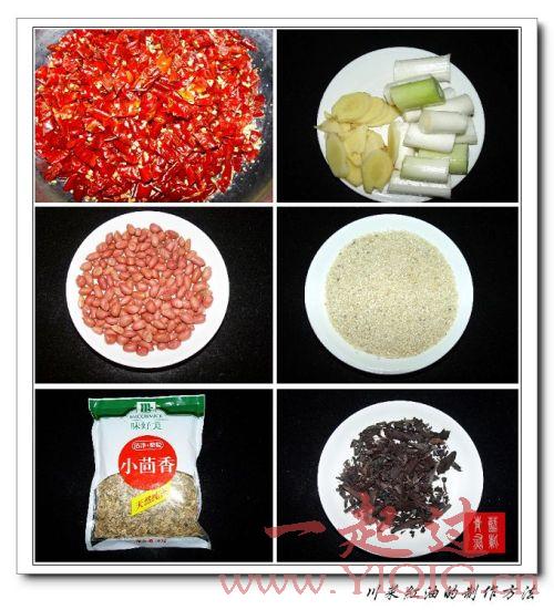 干辣椒1斤半,菜籽油5斤半,姜50克,大葱段50克,去皮花生米、去皮白芝麻仁50克,小茴香50克,紫草5克。