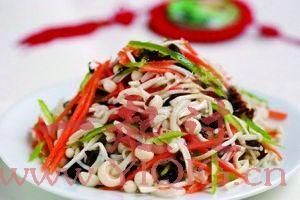 金针菇150克、胡萝卜50克、红辣椒半个(如不能吃辣可改为柿子椒)、瘦肉50克、姜、蒜、葱、生抽、生粉各 五彩金针菇少许。