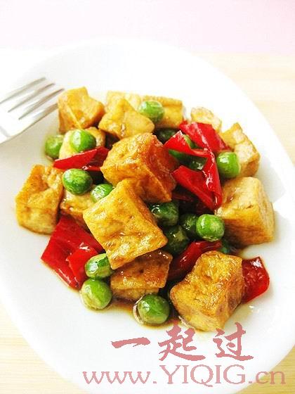 1、北豆腐洗净切成1厘米见方的小块,用开水浸泡去豆腥味。豌豆焯水备用,红椒洗净切片。