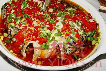 6、从锅中取出碗后,再将炒锅置火上放油烧至十成热,铲起淋在鱼头上即成。