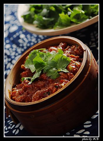 做法:在容器中放入适量蒸肉米粉、豆腐乳和豆腐乳的汁、酒酿、黄酒、花椒面、海椒面、红糖、少许香油、是香油用量4-5倍的菜油或者调和油。把生姜切粒后和葱花放进豆瓣里面剁,越细越好,把这样的混合物放进容器和前面放进去的作料搅拌均匀。调料搅拌均匀后放入切好的嫩牛肉块再次搅拌,使得牛肉和作料充分的结合。把牛肉拌好后静置1小时使牛肉入味。然后把牛肉放进甑脚水已经开的蒸笼大火蒸20分钟出锅。OK,大功告成~