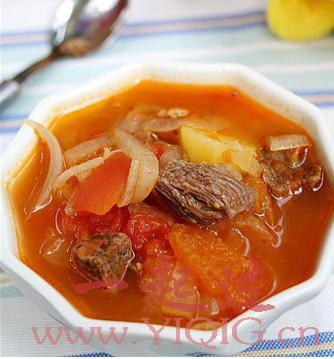 番茄牛肉汤配料:牛肉、洋葱、土豆、番茄(西红柿)、葱白、生姜、迷迭香、番茄酱、黄油(butter)、水。
