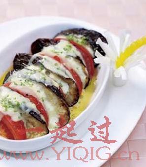 1、将茄子取蒂,斜着切成1cm宽左右的茄片,在水中泡一下即取出滤干。番茄则纵向切半,去蒂之后再均衡地切成4片。在耐热的容器里涂上薄薄的一层黄油。在烤箱里以250℃高温预热7-8分钟。