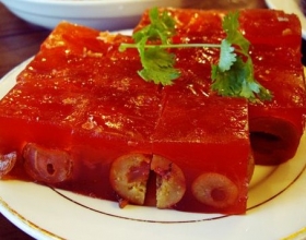 然后,将熬好的山楂酱放入方型容器中,冷却后即可食用(吃时需用小勺)。