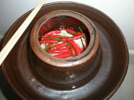 (4) 2-3天后可注意仔细观察,看辣椒周围是否有汽泡形成,开始的时候 ,是一到两个十分细小的气泡,不注意观察几乎看不见.如果有汽泡,哪怕是一个气泡, 就说明发酵正常。(其实观察不到也没关系,放2-3天就可以了)