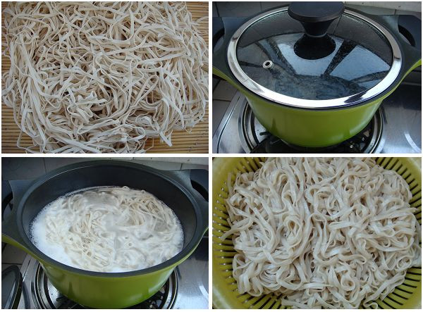 3、锅内把水烧开,放入面条煮至8成熟,把面条捞出淋干,用香油拌匀。
