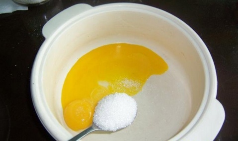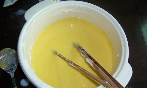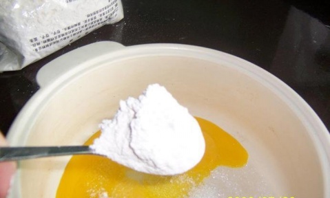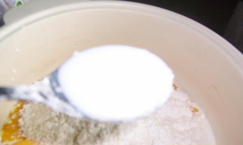 在蛋黄的碗里再加入6平勺牛奶!不多不少刚好6勺。没有牛奶可以用孩旺仔牛奶,如果用饮料也可以,比如橙汁什么的。