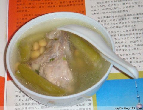 材料:苦瓜,汤骨,黄豆,葱、姜片、酒、盐、鸡精。