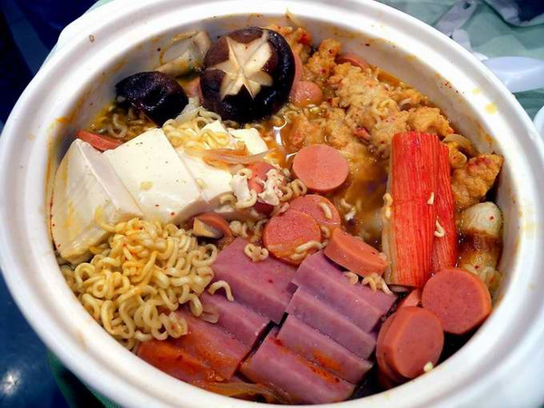 材 料:泡菜300g,泡面1包,罐头火腿1罐,热狗2根,香菇200g,洋葱1颗,豆腐1块,火锅料适量