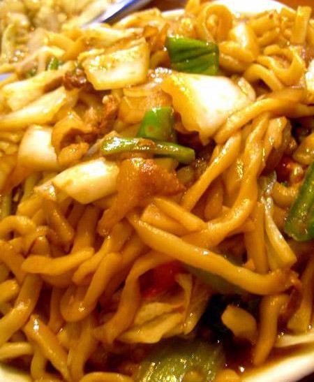 3、锅上火,油烧热,将肉丝、火腿丝、尖椒丝、香菇丝放入炒熟,再加入泡好的面一起炒。