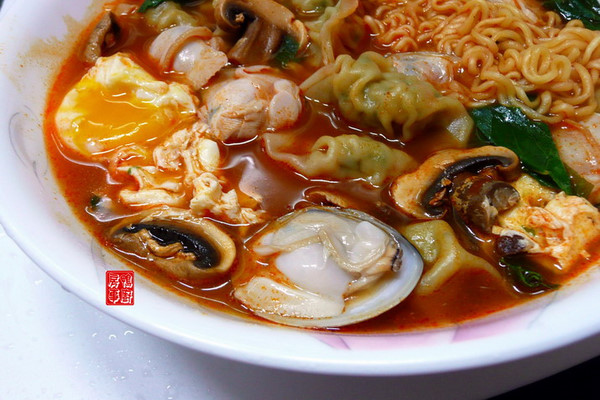 用料:方便面、青菜、鸡蛋。。。冰箱里找得到的东西都往里投放,也是一餐
