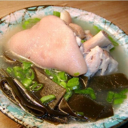用料:海带、花生米、猪蹄子一个、生姜、葱。清汤、盐、鸡精、、胡椒粉少许,绍酒。
