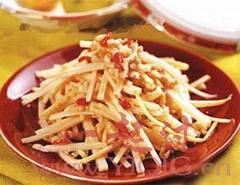 制作:将枸杞子清洗干净待用。猪肉去除筋膜,切成丝;熟青笋切成同样长的细丝。将炒锅烧热,放入猪油,将肉丝、笋丝同时下锅,烹入料酒,加入白砂糖、酱油、味精、精盐搅拌均匀,放人枸杞颠炒几下,淋上麻油拌匀,起锅即成。