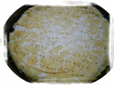 在我的1.4升皇后锅中加入少许橄榄油,把和好的面团在锅中平摊开,用叉子在上面插些小孔透气,撒上黑胡椒粉、洋葱丝、番茄沙司、奶酪丝、蘑菇丝、青、黄、红椒丝以及甜玉米粒和青豆。、