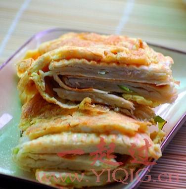 11、饼铛中放油,油热后倒入一半蛋液,蛋液底下一面凝固后,放入烙好的饼,蛋液凝固后翻面倒入另一半蛋液,烙成两面金黄后盛出切块。