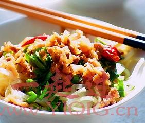 4.乌冬面煮熟盛出,浇入榨菜肉末,麻酱汁,洒上青蒜末,绿豆芽拌均即可。