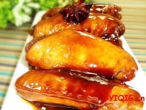 作料:姜末,葱花,八角,花生油适量,可乐一听,鸡翅半斤,白糖少许,酱油等。做法:将鸡翅洗净,并用刀割两道口子,以利进味。油开后,加糖,少许,将鸡翅顺锅沿滑入滚烫的油中,炸之,适时翻动,待外皮泛黄之后,倒入可乐及作料,炖之。待可乐几近熬尽,即可出锅,洒葱花若干,就能吃了。