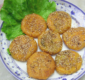 把南瓜去皮去子,直接上笼蒸.蒸烂,取出,捣烂.最好是能把,南瓜里的水控控干! 然后就加糯米粉.至于加多少嘛,我也没计算.反正就是加到面团不沾手,盆光,面光.取一小块,像包汤团差不多,加入豆沙,稍稍压扁,裹上芝麻.入锅煎!(应该是炸出来的,但是自己家里嘛,一切以生活为主,我就用煎的了!呵呵,省油!) 简单吧!如果嗜甜,可以在和面的时候加糖,或蜂蜜.喜欢奶香味的,也可以加点牛奶.反正,自己怎么喜欢就怎么弄吧!