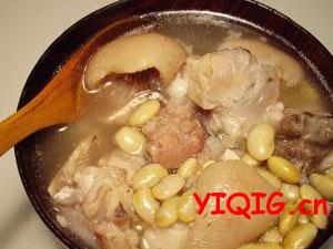 1、经典黄豆炖猪蹄——黄豆炖猪蹄味甘咸性平,有补血通乳、养颜美容,益气和中,生津润燥之功效。