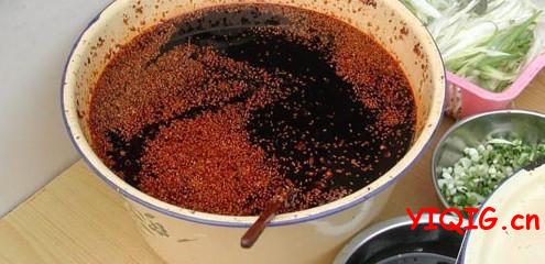 2.另取一不锈钢桶,装入辣椒面,密漏放上面,将炼好的油淋入辣椒面上,淋完后加盖捂一夜即成。特点 鲜族风味独特,色泽鲜红,辣味适中(www.yiqig.cn 一起过)。