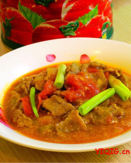 3.留底油,放入姜末洋葱末爆香,放入番茄酱,糖,和水,小火煮2分钟,然后放入番茄煮软后加入牛肉片翻炒均匀,淋水淀粉出锅。