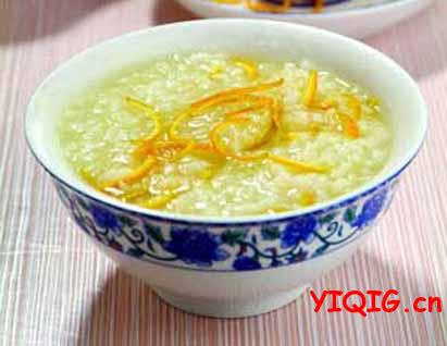 1、橘皮粥:在熬大米粥时,在粥烧滚前,放入几小块干净的橘子皮,等粥煮熟后,不仅芳香可口而且开胃,对胸腹胀满或咳嗽痰多的人,能够起到饮食治疗的作用。