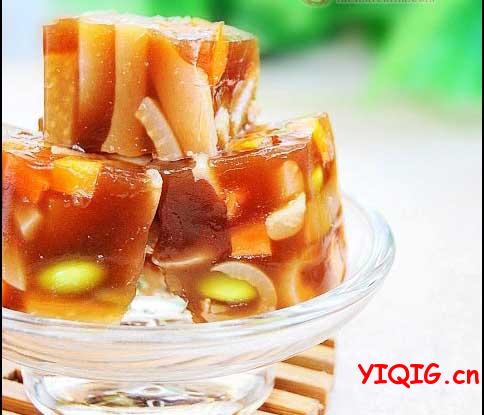 不喜欢肥腻的,记得把猪皮下的脂肪去掉,猪皮有美容的效果,而且它含有丰富的胶原蛋白,可以促进皮肤上的伤口愈合,恢复皮肤弹性,容易留痘痕的MM一定要多吃(一起过www.yiqig.cn)。最关键的是,它的制作成本很低,至少比起某些化妆品来低得多,你还不用担心吃了它会毁容。