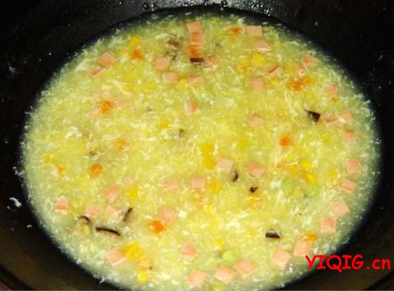3、炒锅制净,烧黄油至五成热,投入洋葱丁爆香,倒入粟米羹、牛奶、鲜汤,下各种丁料,用盐、胡椒、味精调好味,烧沸后用湿淀粉勾芡起锅装入盅内即成。