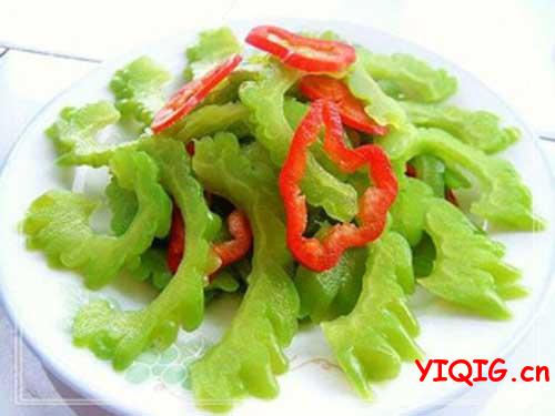 做法:1、把苦瓜去瓤后切成小条,在开水中烫一下入凉开水浸凉后捞出,控去水(一起过www.yiqig.cn)。