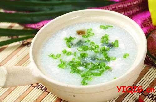 5、第二天早上,把皮蛋切碎,把昨晚煲好的咸肉粥重新煮开,放进碎皮蛋,再煮半个小时,撒上葱花,就可以吃上咸香扑鼻的咸瘦肉皮蛋粥了(一起过www.yiqig.cn)。