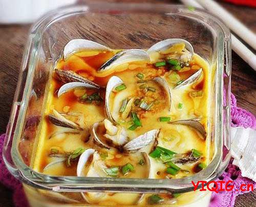 做法:1)准备食才--花蛤放淡盐水浸泡半天,洗净。2)把花蛤用水煮开,捞出。(水别倒掉)3)把蛋打匀,放些盐,料酒,生姜水,葱花,胡椒粉,植物油,煮花蛤的水,搅拌均匀。隔水蒸5分钟左右。4)放下花蛤,再蒸3分钟左右。5)倒些蒸鱼豉油即可。