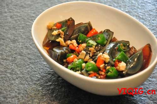 做法:1)准备好皮蛋,这里我拍了三个,其实我用了5个皮蛋2)去壳3)去壳后在冷开水里面透一下4)已经透好了5)对半切开6)辣椒4个7)放在火里烧8)烧成虎皮状9)就这样就行了,等凉后去皮就做好了10)辣椒弄成丝放在皮蛋上就可以了