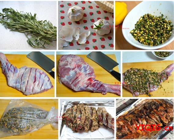 羊腿一只、柠檬半只,迷迭香、大蒜、孜然、黑胡椒、盐、老抽、蜂蜜适量