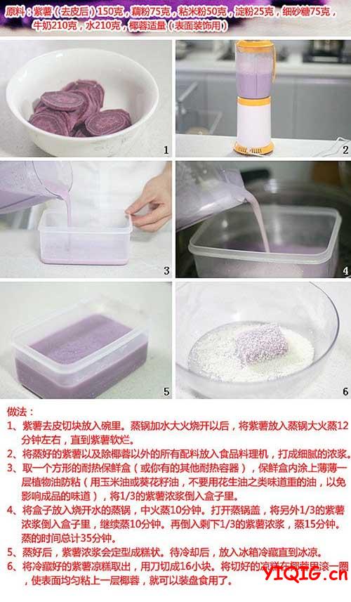 1.紫薯去皮切块放入碗里,蒸锅加水大火烧开以后,将紫薯放入蒸锅大火蒸12分钟左右,直到紫薯软烂;将蒸好的紫薯以及除椰蓉以外的所有材料放入食品料理机,打成细腻的浓浆