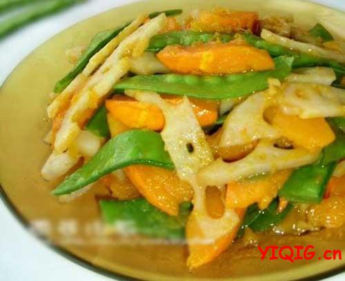 1.南瓜洗净切长条块备用,莲藕斜切片,每片切三长条备用,荷兰豆洗净备用。