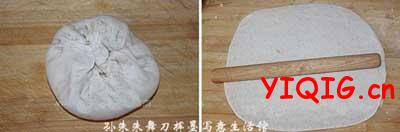 16.将面团擀开成薄一点的大饼,饼要擀得比平底锅大一大圈