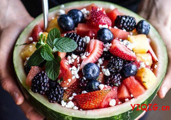 2.将剩下的瓜瓤切成块,加入喜食的其他水果和熬好冷却的西瓜汁,一起倒进空西瓜壳中,放入电冰箱使之凝结成冻即可。
