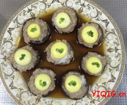 原料:粗茄子、肉馅、洋葱末、鸡蛋、香菜末、调料随意。