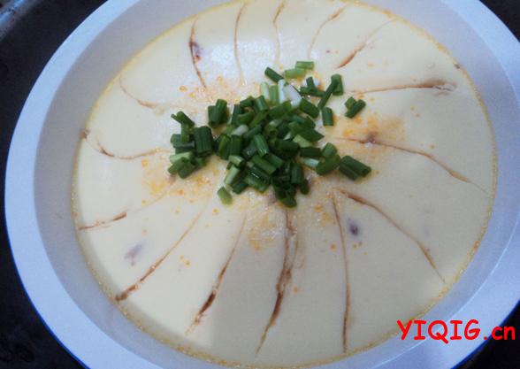 7.烧开后用湿淀粉勾芡,待汁转浓,浇在蒸熟的蛋羹上即可。