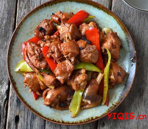 4.锅内再加适量油烧热,大火爆香姜片、豆豉、蒜头,将腌好的鸡入锅赞少许酒,淋入调味料(蚝油1汤匙,生抽1汤匙,糖1/2茶匙,上汤5汤匙,生粉1茶匙)兜匀,盖上锅盖煮至差不多收水时加入青椒,待熟后将土豆片回锅兜匀,最后淋几滴麻油装碟上桌即可