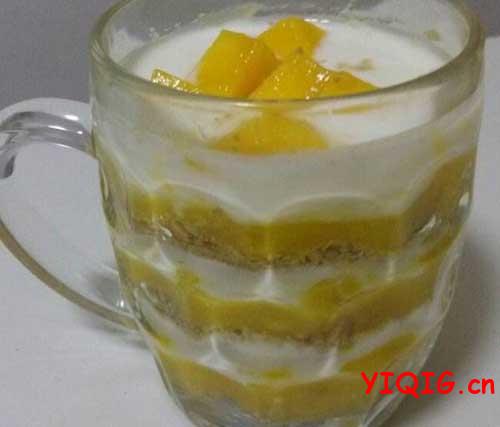 2把芒果泥铺在杯底,然后依次将酸奶、麦片、芒果泥填入杯中。