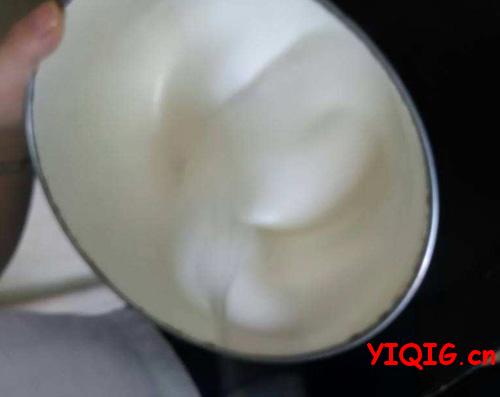 3.蛋白加入1/3的砂糖(共50克)中高速打至细腻泡沫,再加入1/3砂糖,高速继续打至呈现纹路的状态。