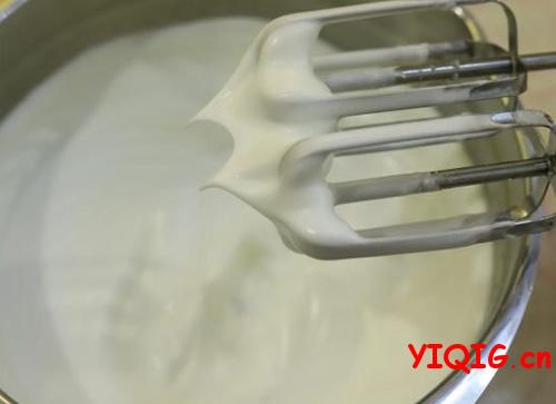 4.把剩下的砂糖都加入,继续打至干性发泡的状态。即是提起打蛋器的时候,蛋白能拉出一个短小直立的尖角,如果你不懂我说的这些形容词,这时你若把容器倒过来发现它也不会掉下来的,就说明已经打好了。
